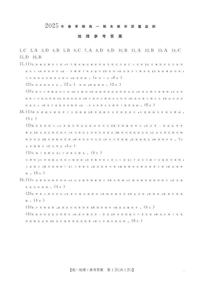 南宁市2024-2025学年高一下学期期末教学质量监测 地理答案.pdf