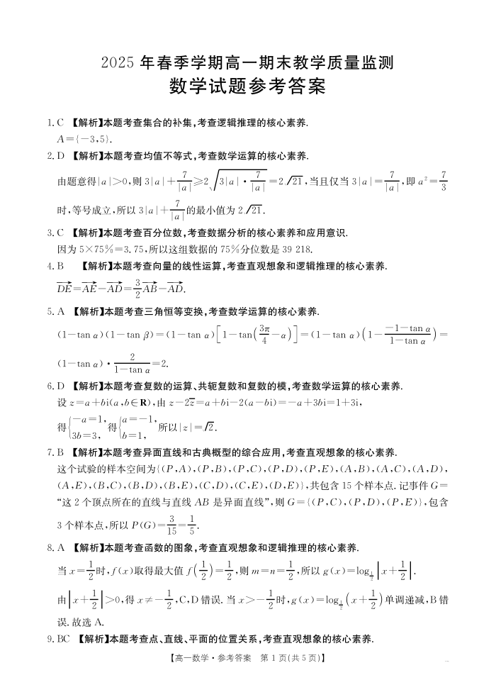 贺州市2024-2025学年高一下学期期末教学质量监测 数学答案.pdf