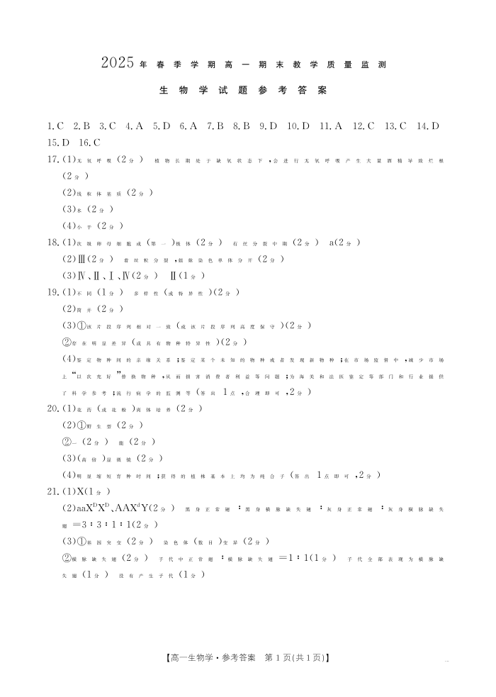贺州市2024-2025学年高一下学期期末教学质量监测 生物答案.pdf