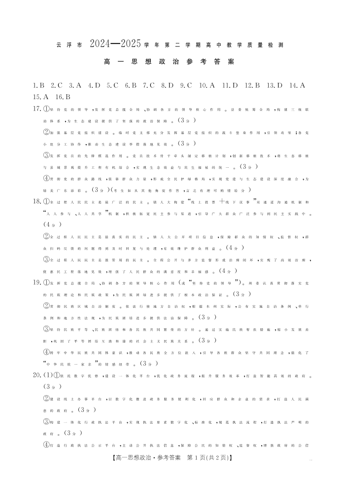 广东省云浮市2024--2025学年高一下学期高中教学质量检测 政治答案.pdf