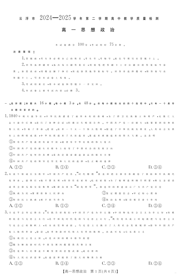 广东省云浮市2024--2025学年高一下学期高中教学质量检测 政治.pdf