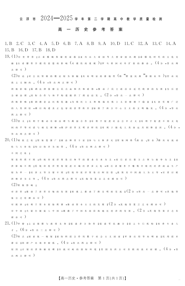 广东省云浮市2024--2025学年高一下学期高中教学质量检测 历史答案.pdf