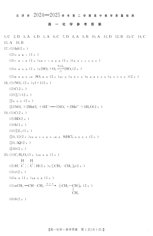 广东省云浮市2024--2025学年高一下学期高中教学质量检测 化学答案.pdf