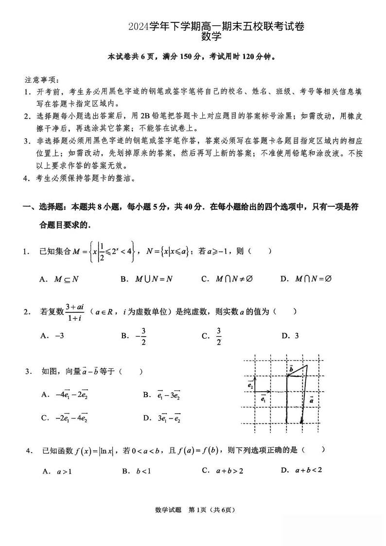 广东省五校联考2024学年下学期高一期末考试 数学试卷(含答案).pdf