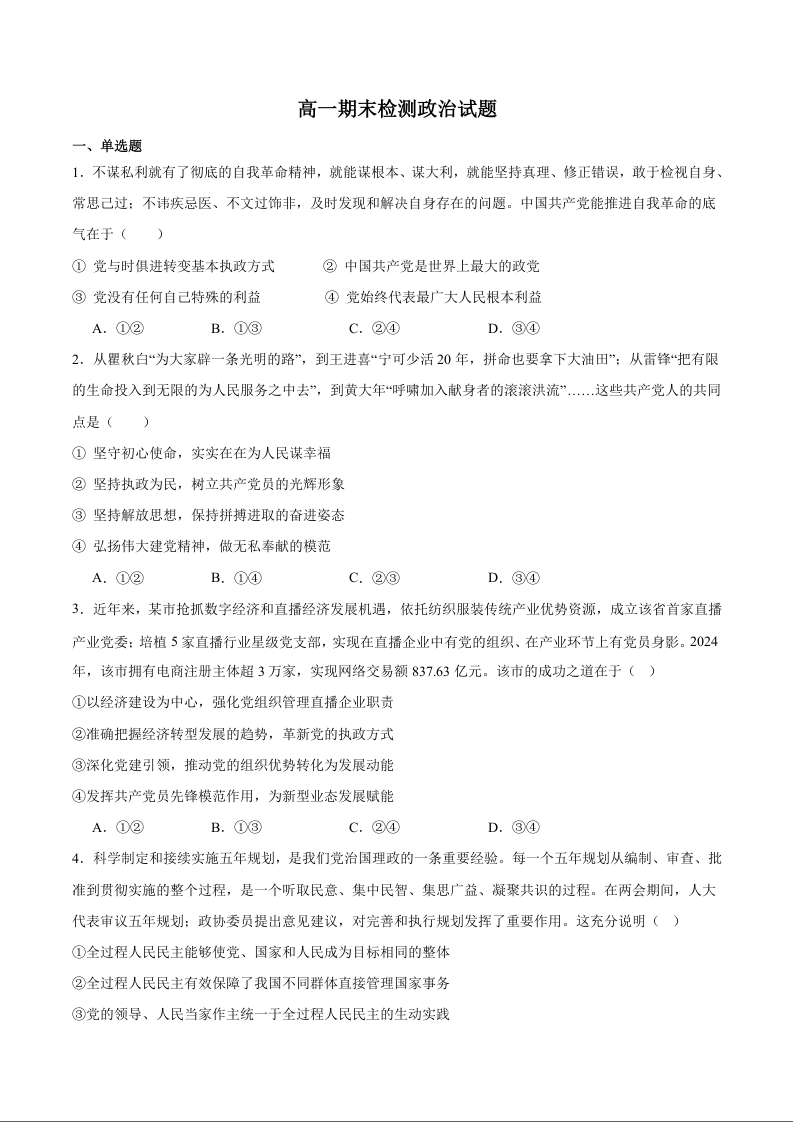甘肃省白银市2024-2025学年高一下学期期末检测 政治试卷(含答案).docx