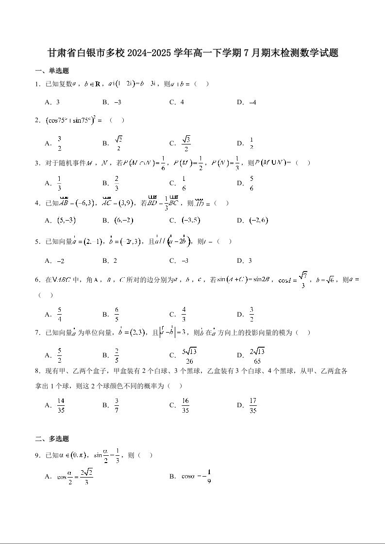 甘肃省白银市2024-2025学年高一下学期期末检测 数学试卷(含答案).docx