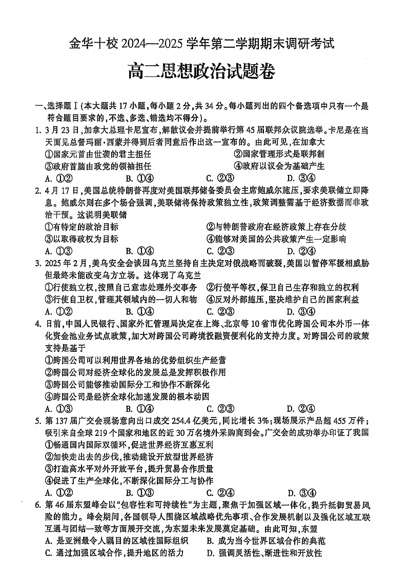 金华十校2024-2025学年第二学期期末调研考试 政治.pdf