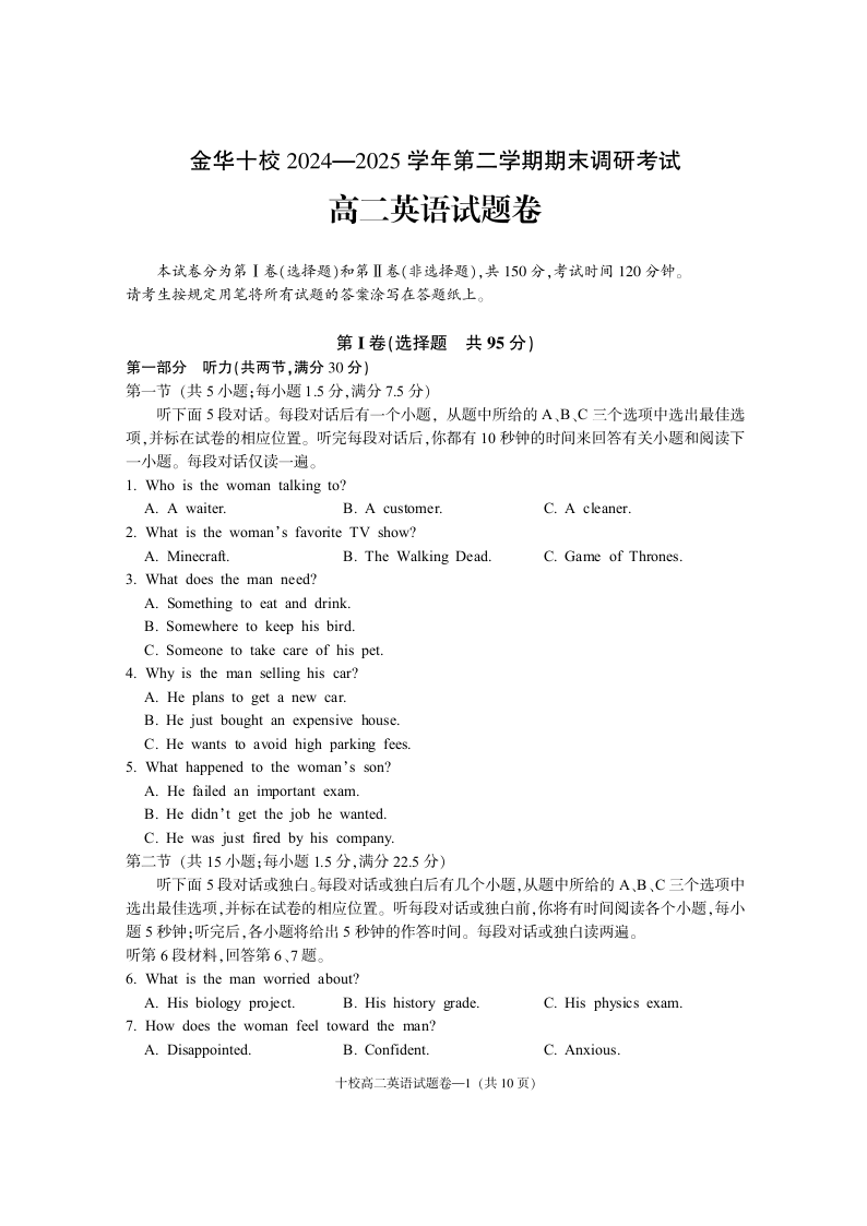 金华十校2024-2025学年第二学期期末调研考试 英语.pdf