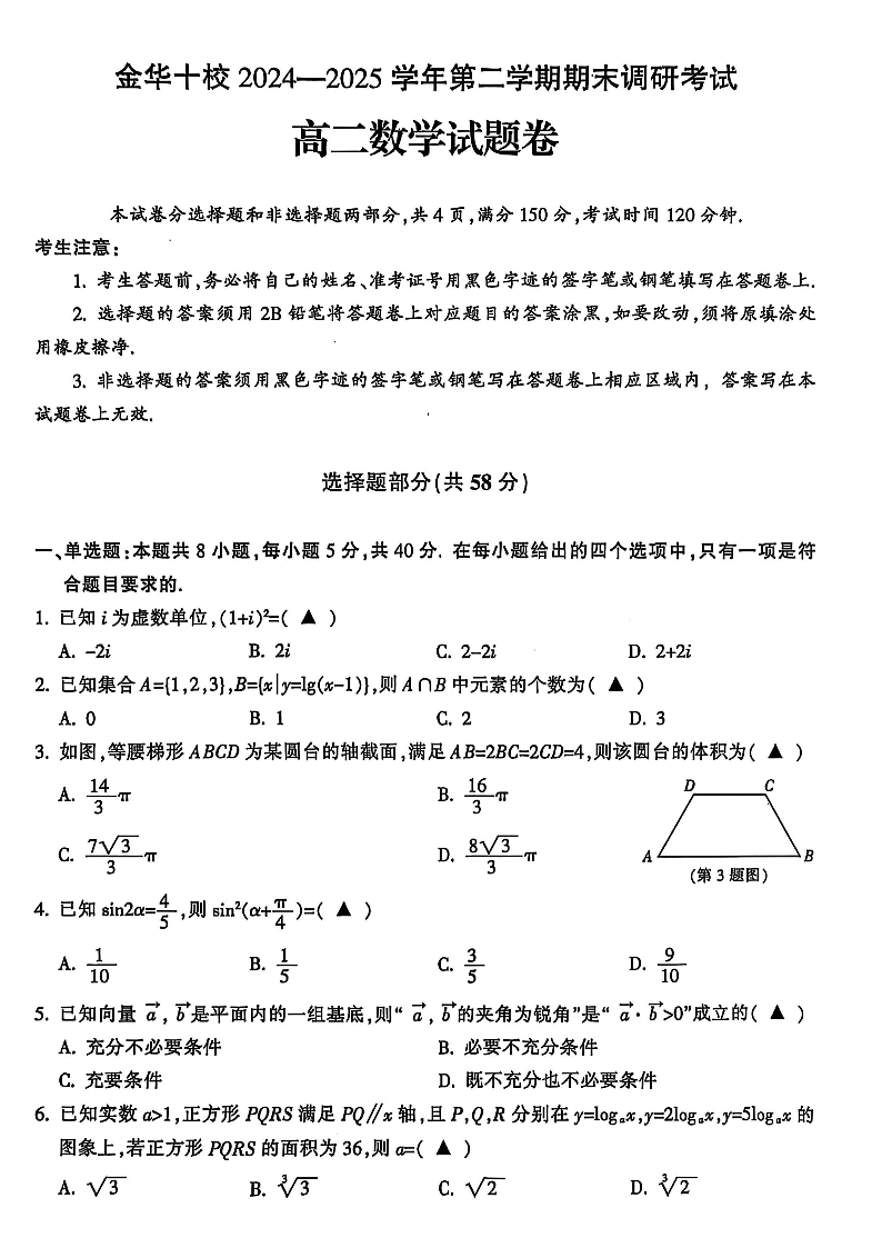 金华十校2024-2025学年第二学期期末调研考试 数学.pdf