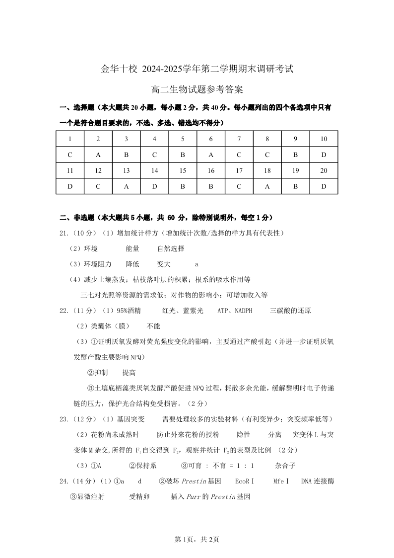 金华十校2024-2025学年第二学期期末调研考试 生物答案.pdf