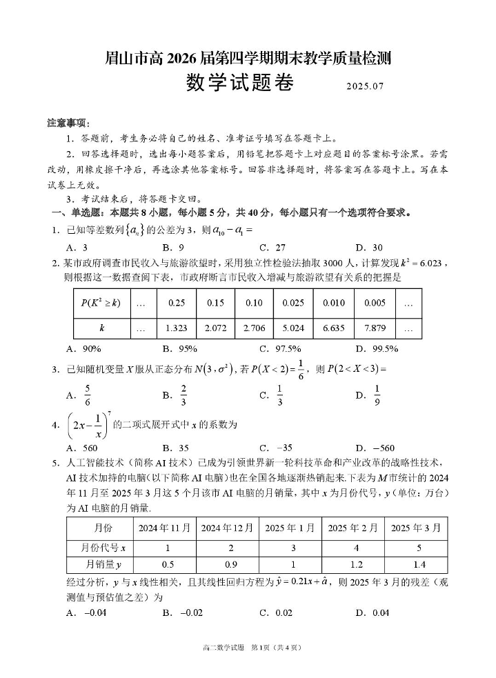 眉山市高2026届第四学期期末教学质量检测 数学试卷(含答案).pdf