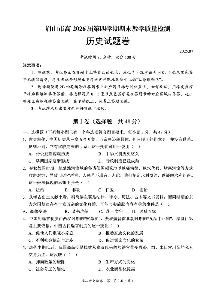 眉山市高2026届第四学期期末教学质量检测 历史试卷(含答案).pdf