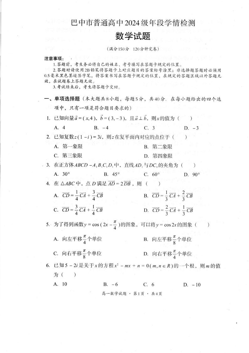 巴中市普通高中2024级年段学情检测 数学试卷(含答案).pdf