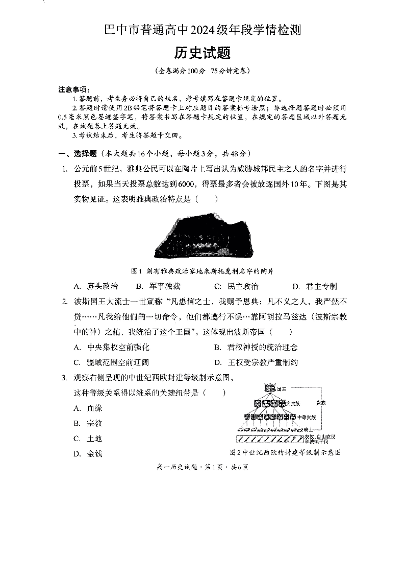 巴中市普通高中2024级年段学情检测 历史试卷(含答案).pdf