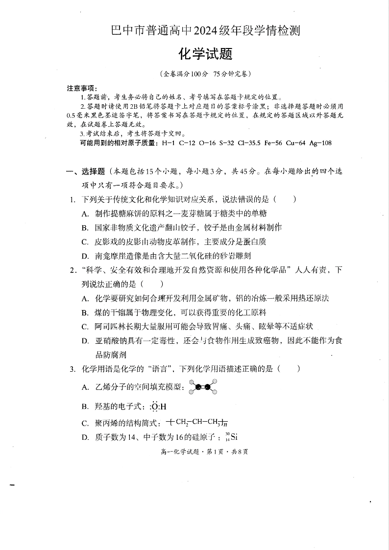 巴中市普通高中2024级年段学情检测 化学试卷(含答案).pdf