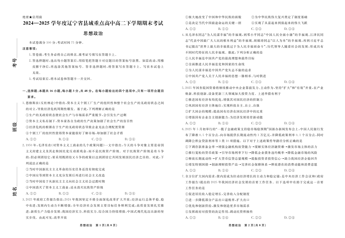 【政治】辽宁省县域重点高中2024-2025学年度高二下学期期末考试.pdf