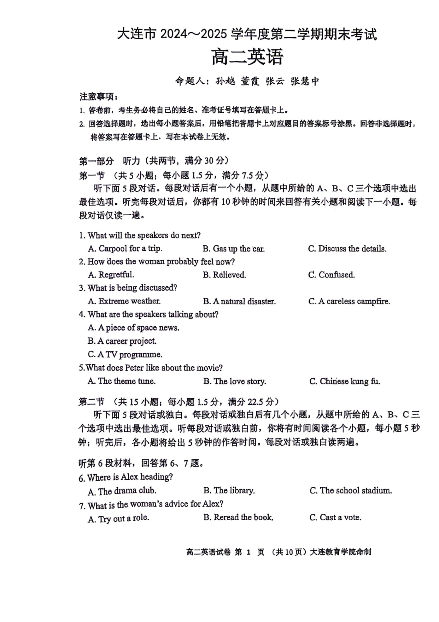 辽宁省大连市2024-2025学年度第二学期高二年级期末考试 英语试卷(含答案).pdf