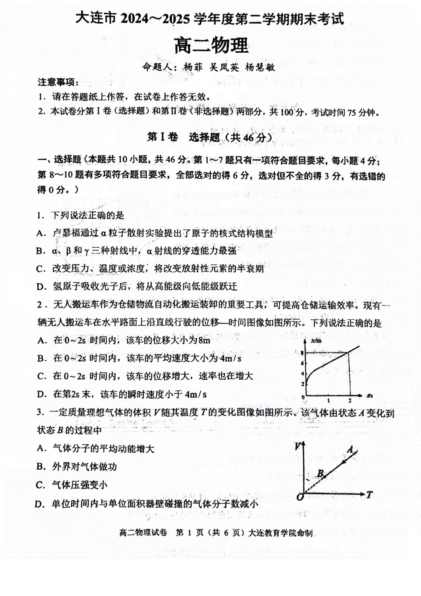 辽宁省大连市2024-2025学年度第二学期高二年级期末考试 物理试卷(含答案).pdf