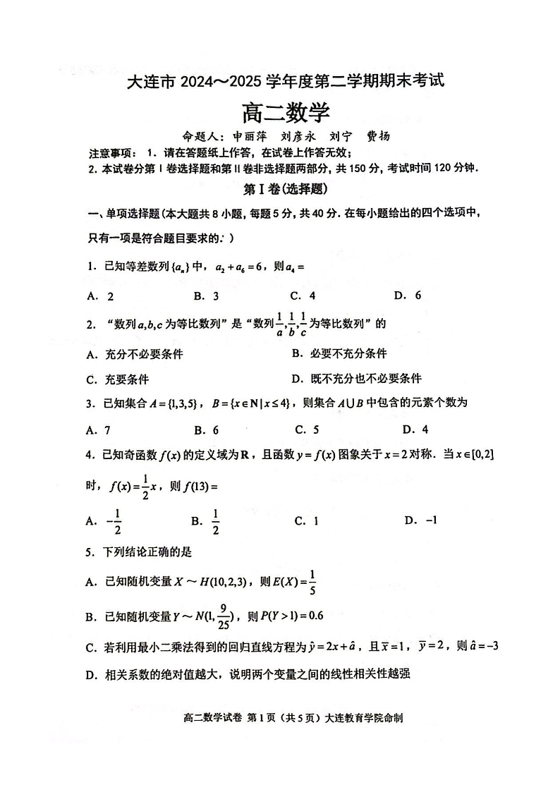 辽宁省大连市2024-2025学年度第二学期高二年级期末考试 数学试卷(含答案).pdf