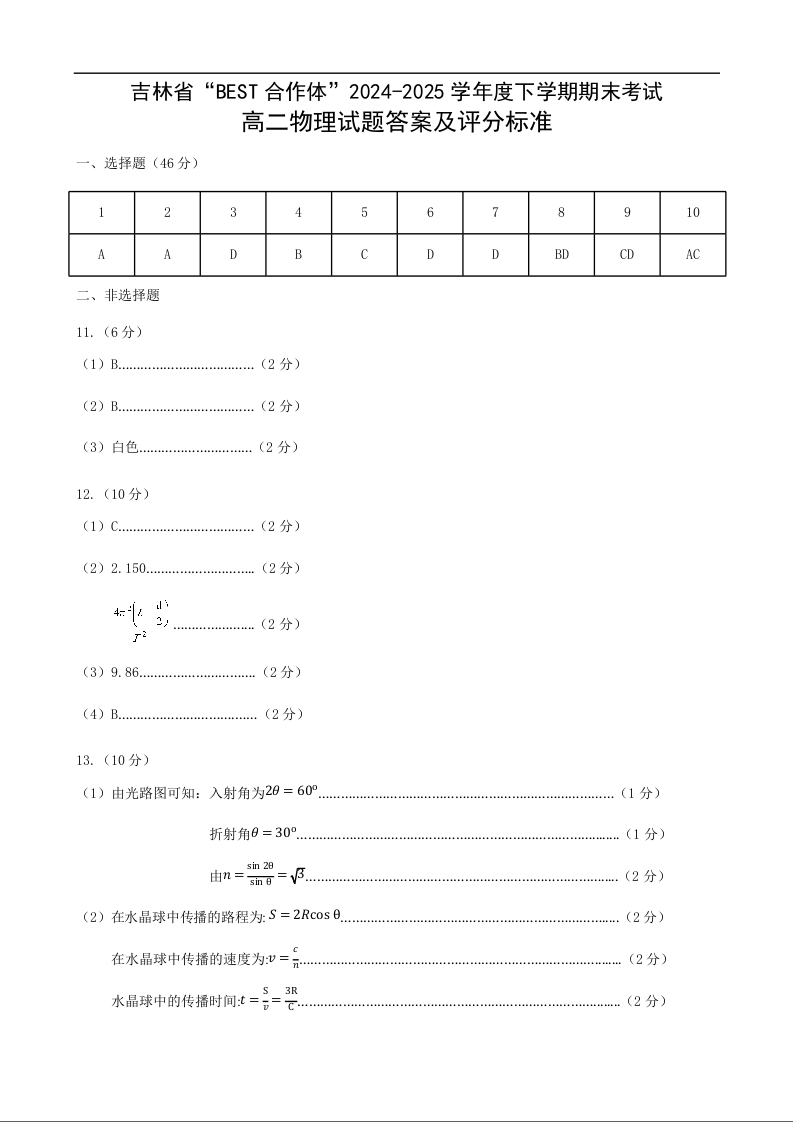 吉林省“BEST合作体”2024-2025学年高二下学期7月期末 物理答案.docx