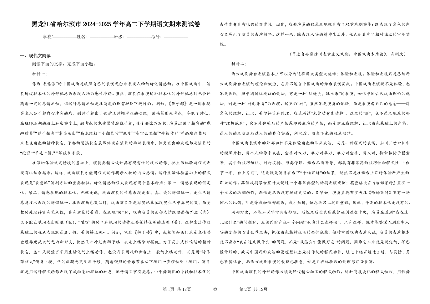 哈尔滨市2023级高二学年学业质量检测 语文试卷(含答案).docx