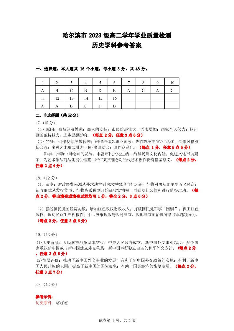 哈尔滨市2023级高二学年学业质量检测 历史答案.pdf