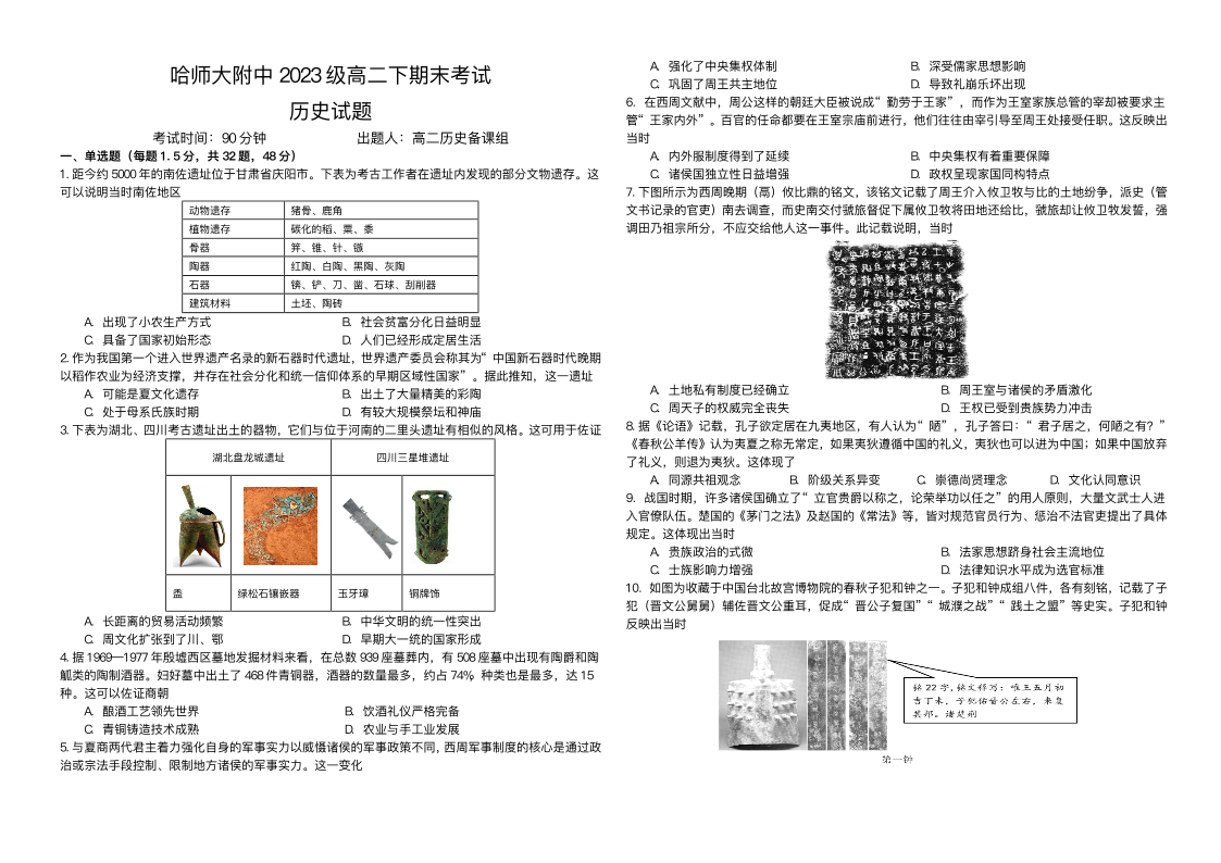 哈师大附中2024~2025学年度下学期高二期末考试 历史试卷(含答案).pdf