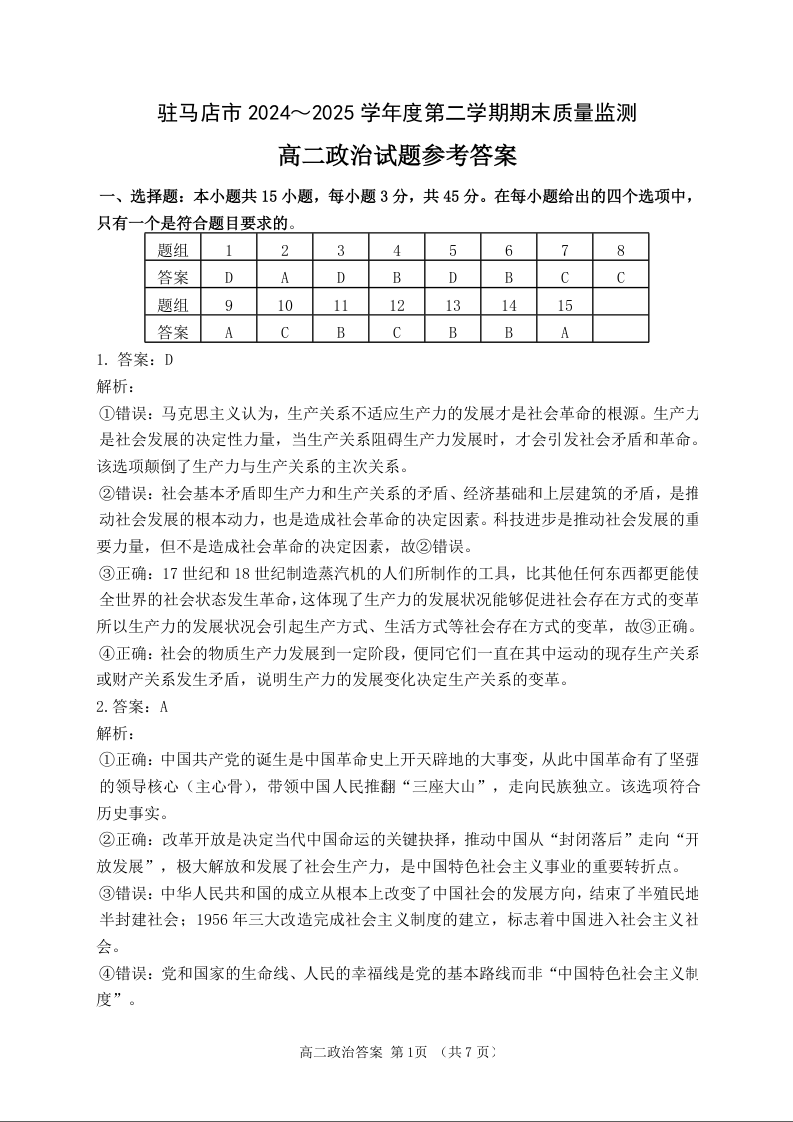 驻马店市2024~2025学年度第二学期期末质量监测 政治答案.docx