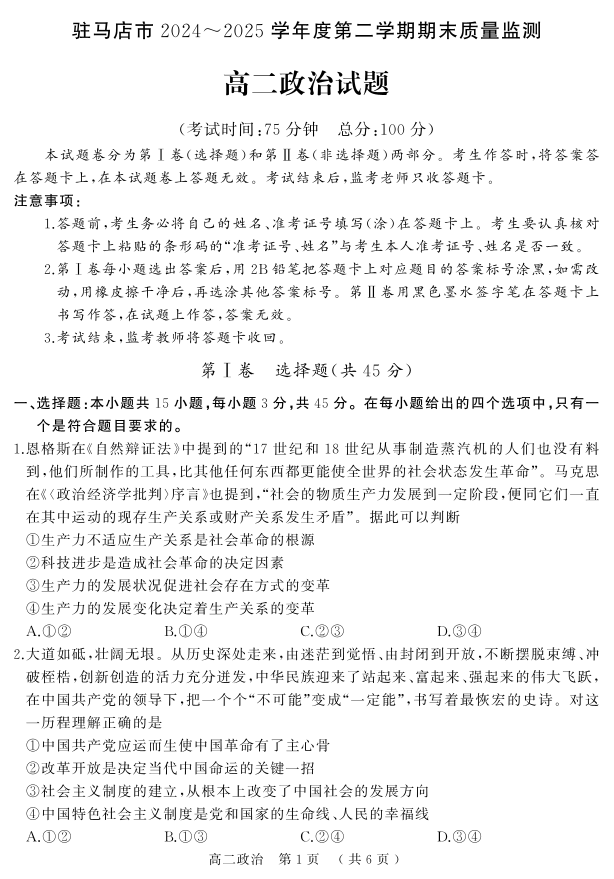 驻马店市2024~2025学年度第二学期期末质量监测 政治.pdf