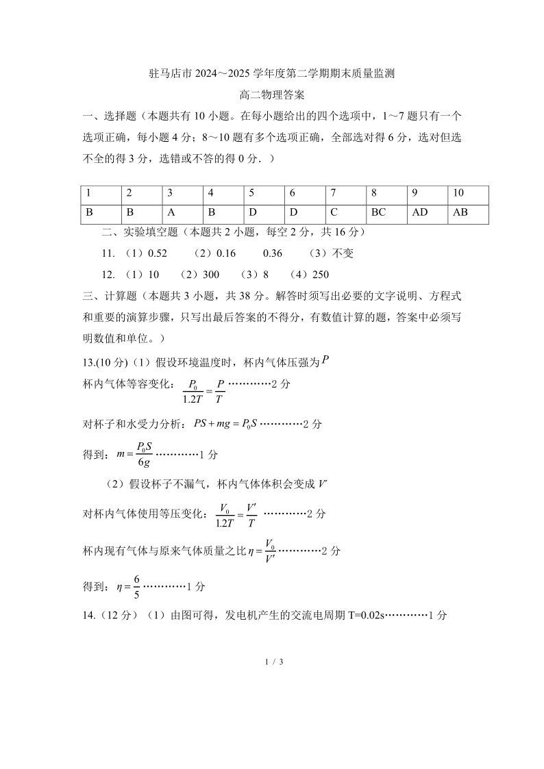 驻马店市2024~2025学年度第二学期期末质量监测 物理答案.pdf