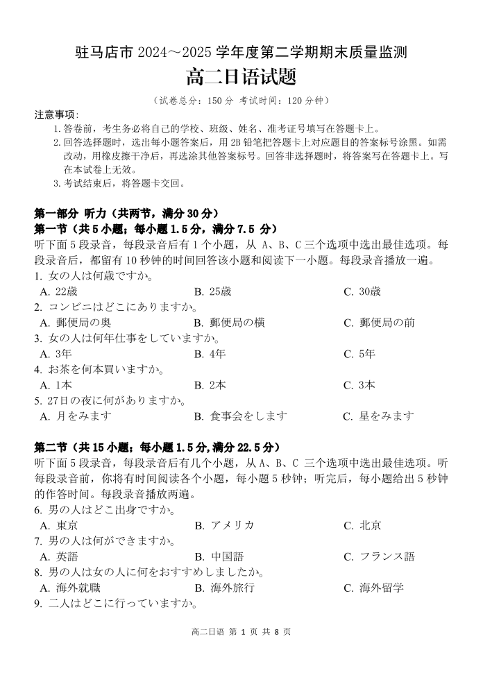 驻马店市2024~2025学年度第二学期期末质量监测 日语.pdf