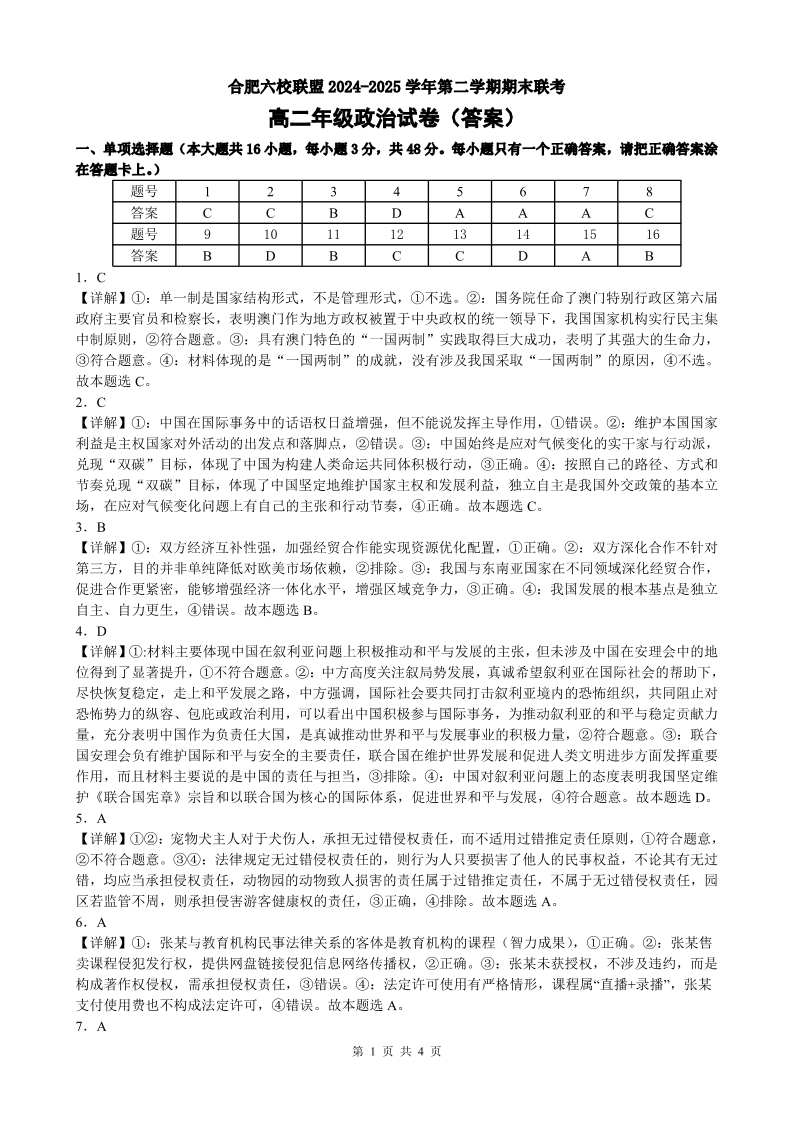 合肥市普通高中六校联盟2024-2025学年第二学期高二年级期末联考 政治答案.pdf