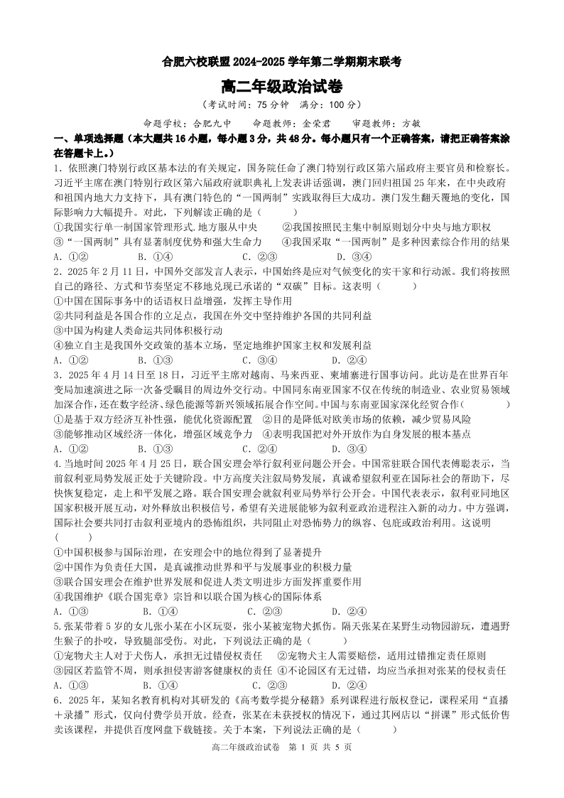 合肥市普通高中六校联盟2024-2025学年第二学期高二年级期末联考 政治.pdf