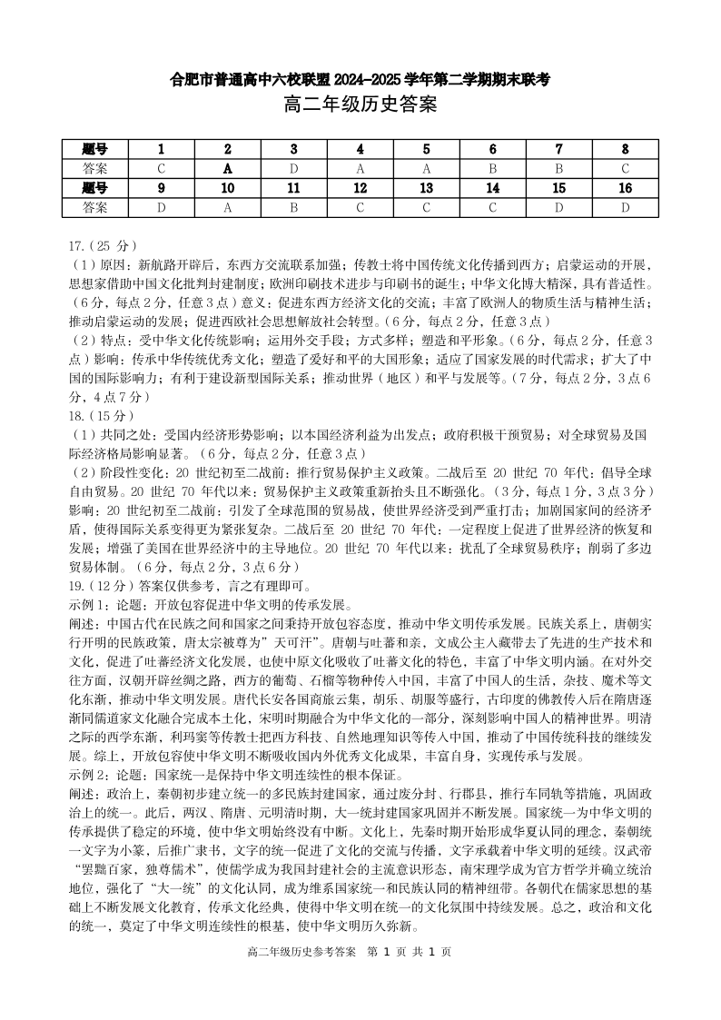 合肥市普通高中六校联盟2024-2025学年第二学期高二年级期末联考 历史答案.pdf