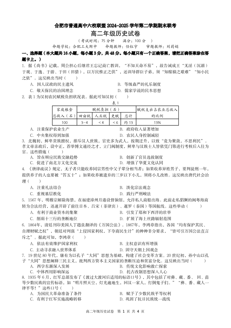 合肥市普通高中六校联盟2024-2025学年第二学期高二年级期末联考 历史.pdf
