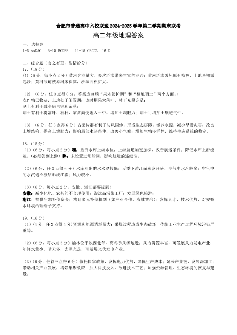 合肥市普通高中六校联盟2024-2025学年第二学期高二年级期末联考 地理答案.pdf