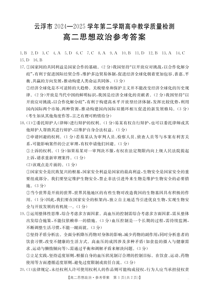 广东省云浮市2024-2025学年高二下学期高中教学质量检测 政治答案.pdf