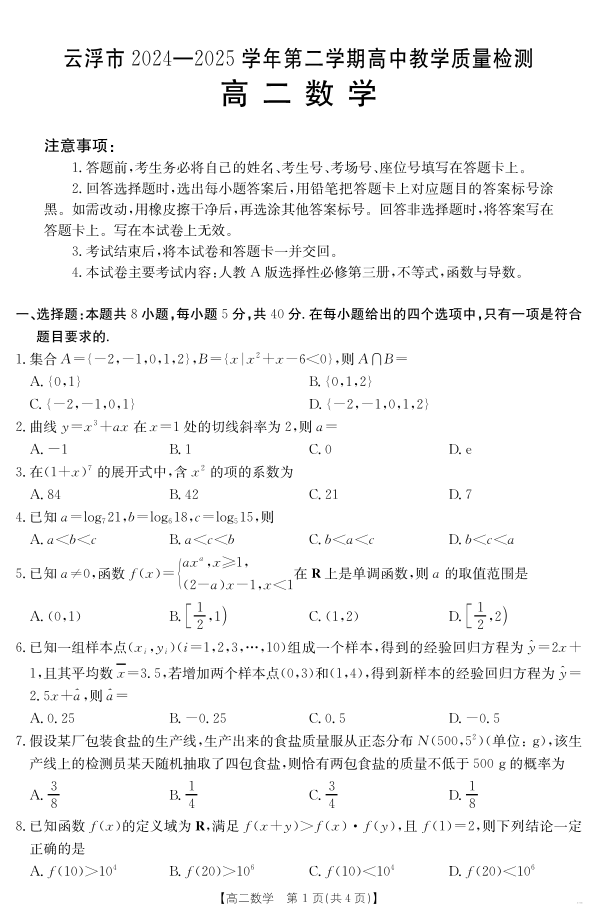广东省云浮市2024-2025学年高二下学期高中教学质量检测 数学.pdf
