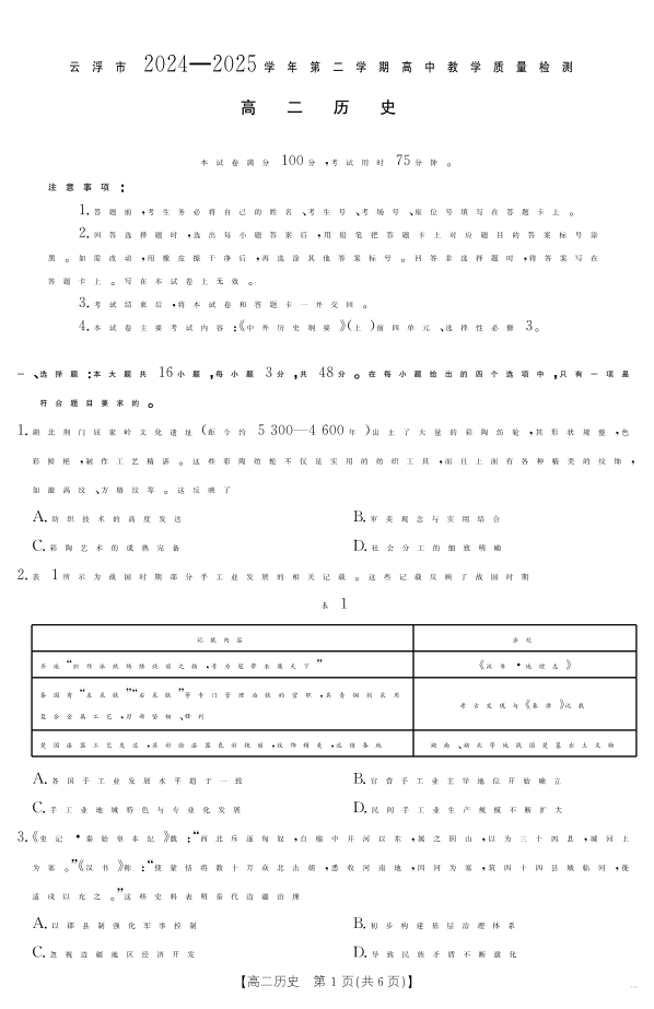 广东省云浮市2024-2025学年高二下学期高中教学质量检测 历史.pdf