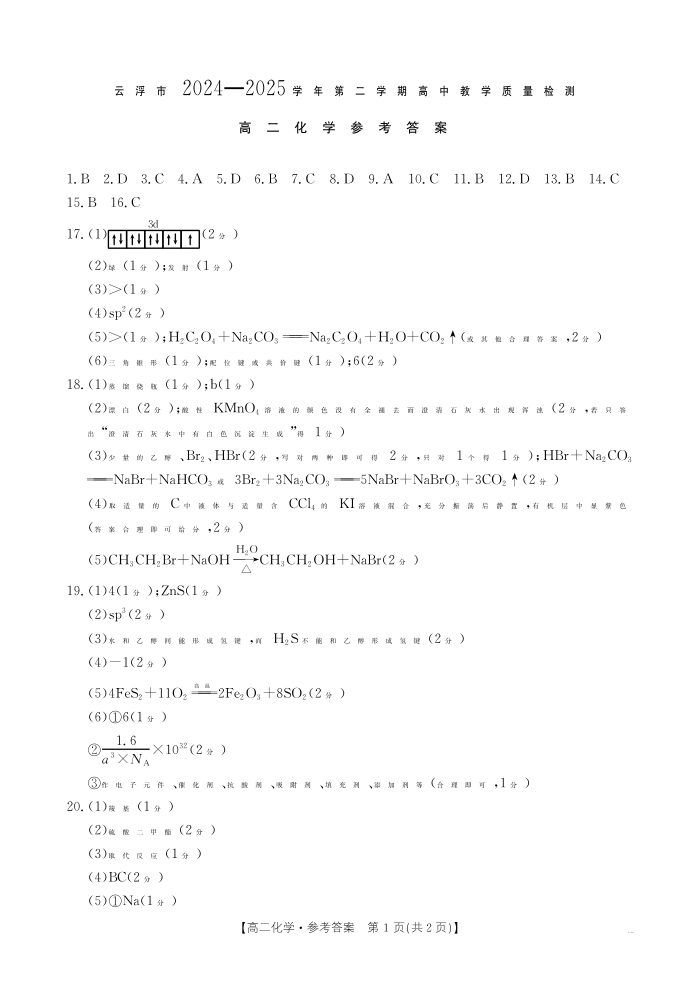广东省云浮市2024-2025学年高二下学期高中教学质量检测 化学答案.pdf