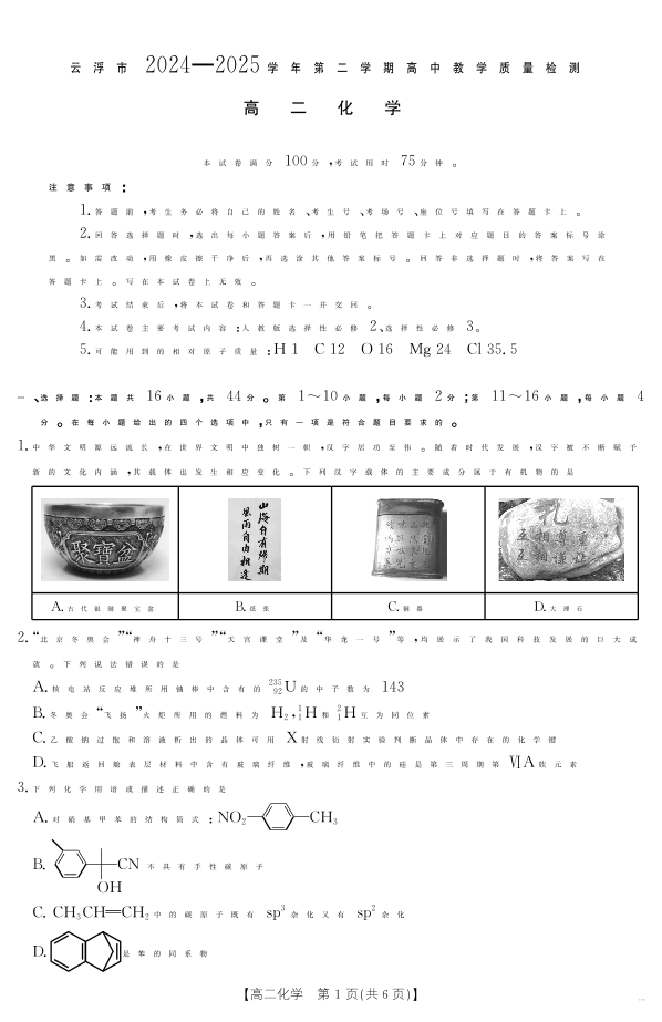广东省云浮市2024-2025学年高二下学期高中教学质量检测 化学.pdf