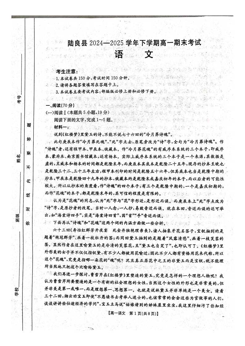 云南省曲靖市陆良县2024-2025学年高一下学期期末考试 语文.pdf