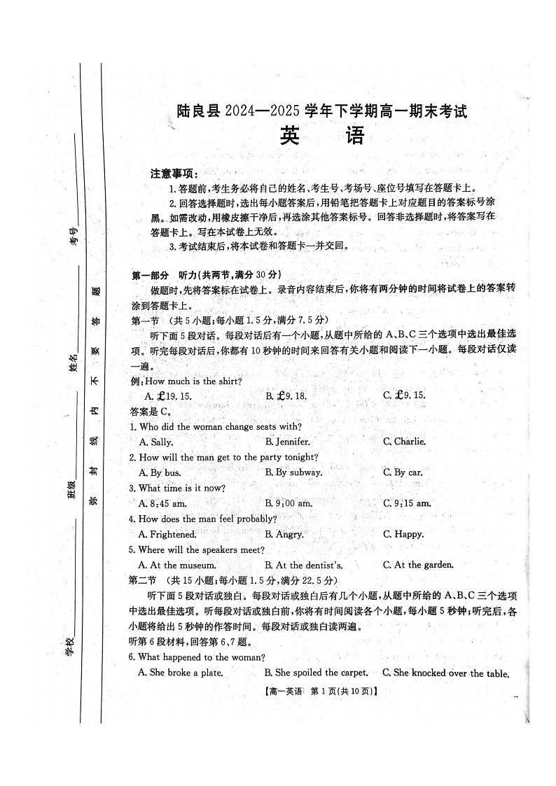 云南省曲靖市陆良县2024-2025学年高一下学期期末考试 英语.pdf