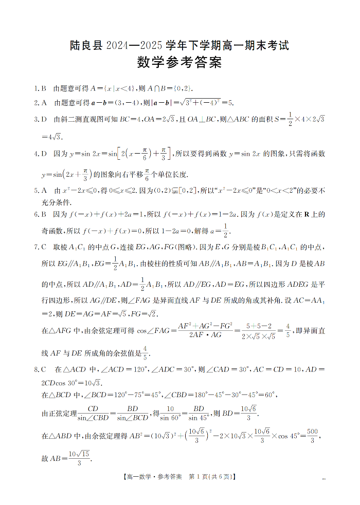 云南省曲靖市陆良县2024-2025学年高一下学期期末考试 数学答案.pdf
