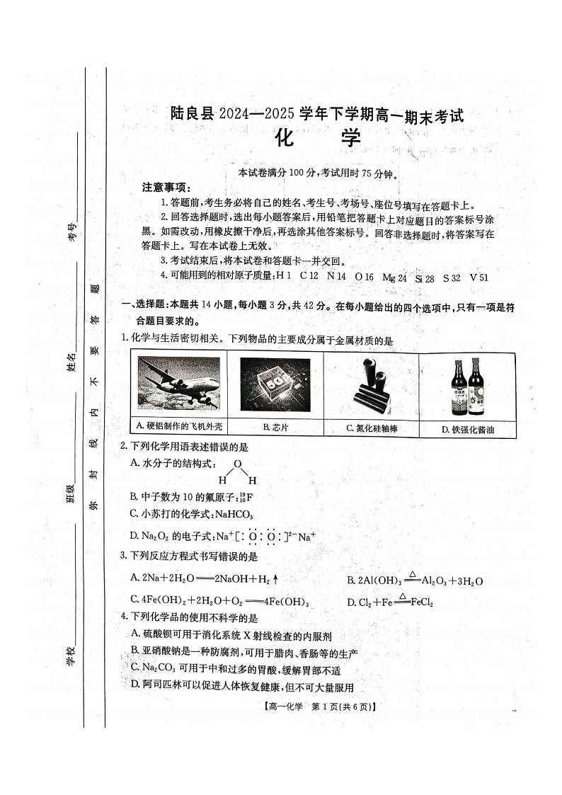 云南省曲靖市陆良县2024-2025学年高一下学期期末考试 化学.pdf