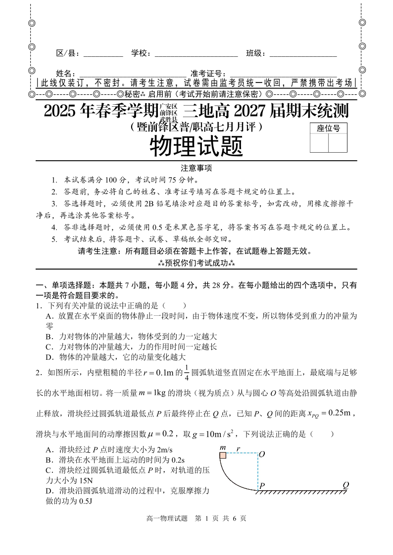 2025年春季学期三地高2027届期末统测 物理试卷(含答案).pdf