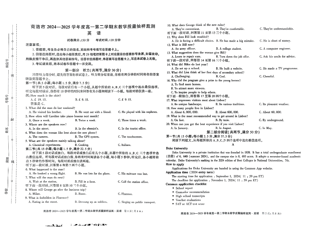商洛市2024—2025学年度高一第二学期末教学质量抽样监测 英语试卷(含答案).pdf