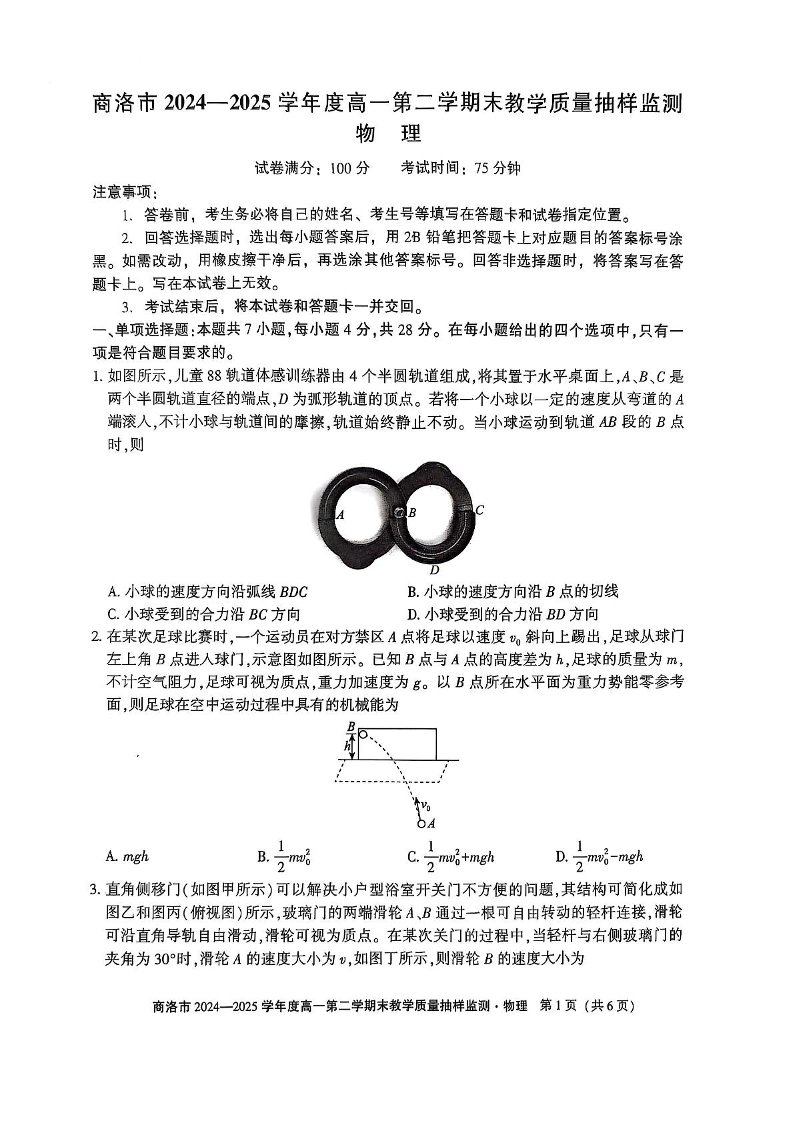 商洛市2024—2025学年度高一第二学期末教学质量抽样监测 物理试卷(含答案).pdf