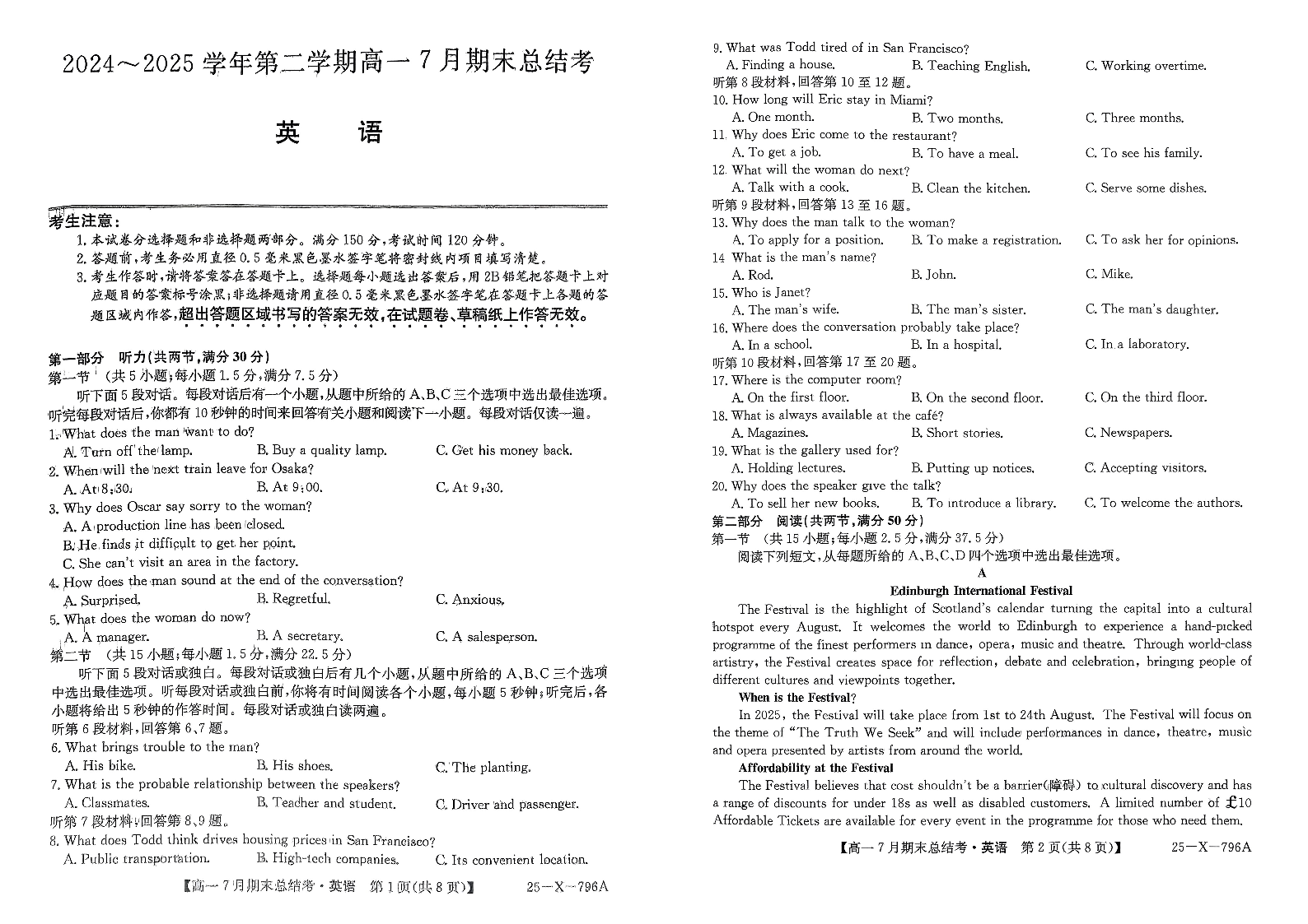山西省三晋卓越联盟2024-2025学年高一下学期7月期末总结考 英语试卷(含答案).pdf