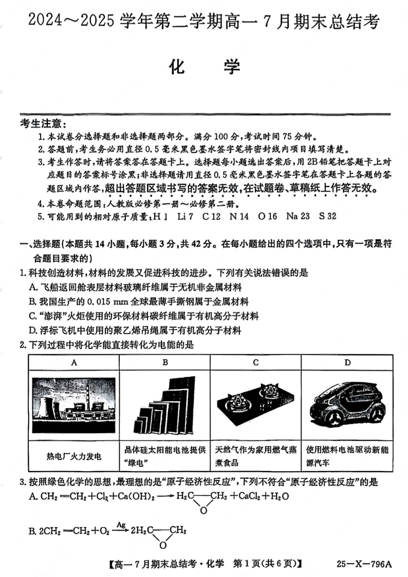 山西省三晋卓越联盟2024-2025学年高一下学期7月期末总结考 化学试卷(含答案).pdf